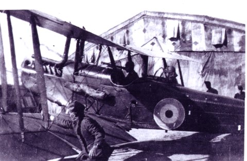 He flew in Palestine as an Observer but later trained and qualified as a pilot. He served in 113 Squadron. We have found maps in T.E Lawrence's "The Seven Pillars of Wisdom " which are included with this historical summary and on which we hope to plot his and the squadron's movements. [See also under other Notes Gertrude Bell's journey maps of the changing frontier scene in Arabia at this time]. This reference to Lawrence is interesting because we recall that William mentioned that he flew gold bullion to Lawrence [see notes] to support the Arabian tribes to encourage their substantial and finally successful sabotage of the Turkish army, and/or that he flew Lawrence on one sortie [my brother Peter recalls the bullion and I recall the Lawrence flight - one of us is right, we presume but we do not know whom !]. See also under notes Bell's reference to Lawrence's brother, who apparently was in the RFC, being killed in the area about 1917. (Above photo, two men hold the wing struts on either side as the aircraft prepares for takeoff, note the unusual tent with stripes and diamond designs, one would think this is an old circus tent?)We do not know when William Woods finally left Egypt nor when the Squadron returned to the UK but we intend to research the history of 113 Squadron to learn more about its campaign in Palestine and will publish the results here on this web site when we learn anything definitive. We are also attaching copies of the photographs of William in the RFC in Palestine and Egypt. We do not know the names of any of the other personnel in the photographs, I'm sorry to say.